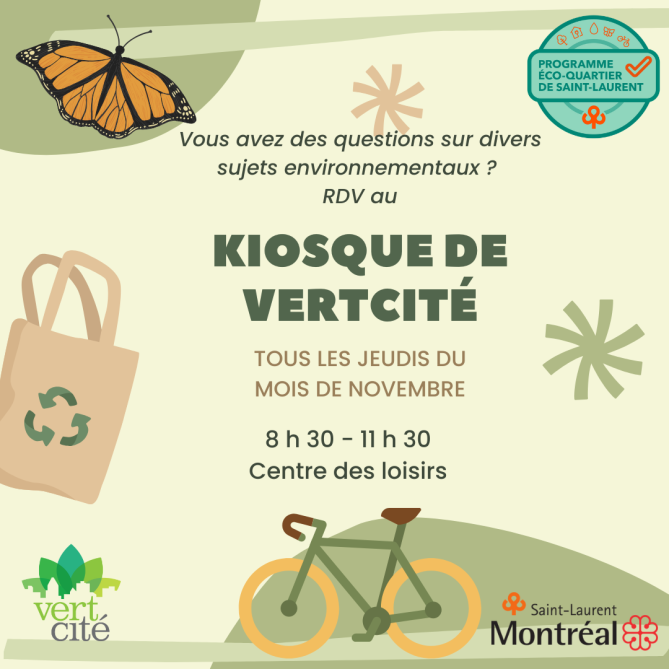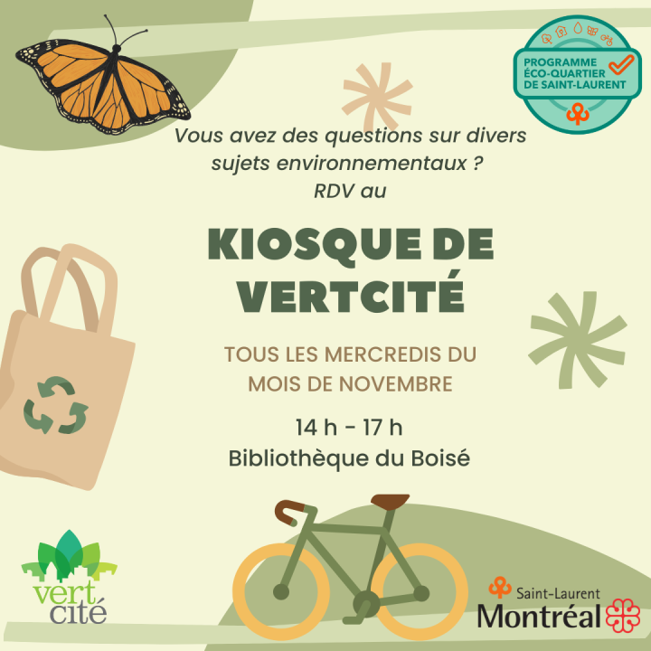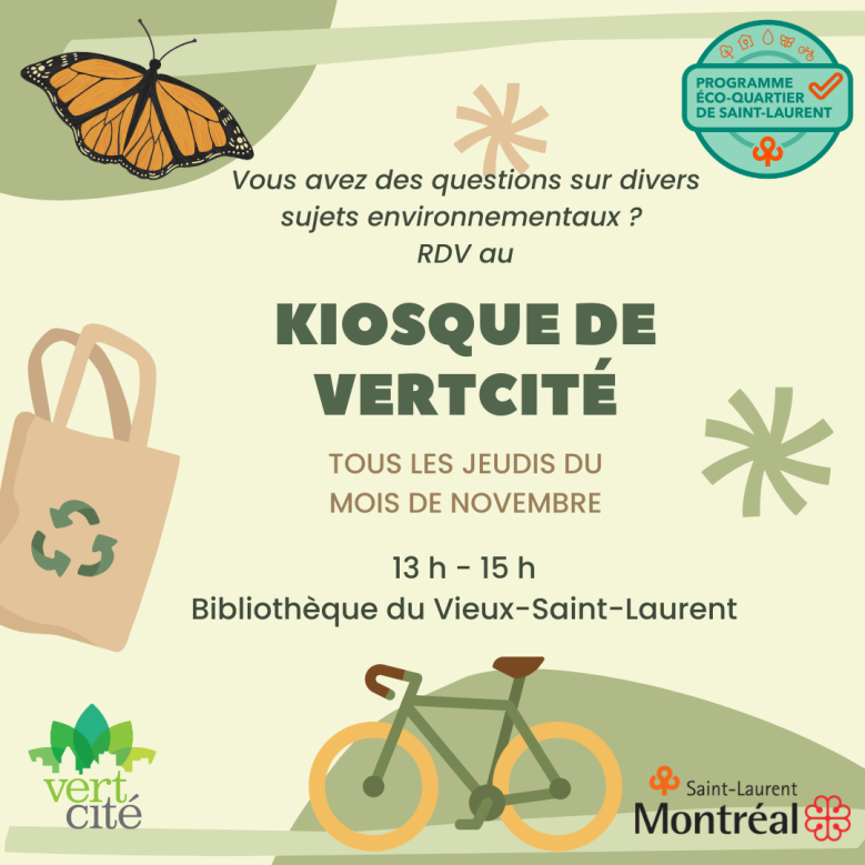 Chaque jeudi de novembre, de 13 h à 15 h, retrouvez l’équipe de VertCité à son kiosque à la Bibliothèque du Vieux Saint-Laurent ! 💬 Chaque semaine, un nouveau thème...